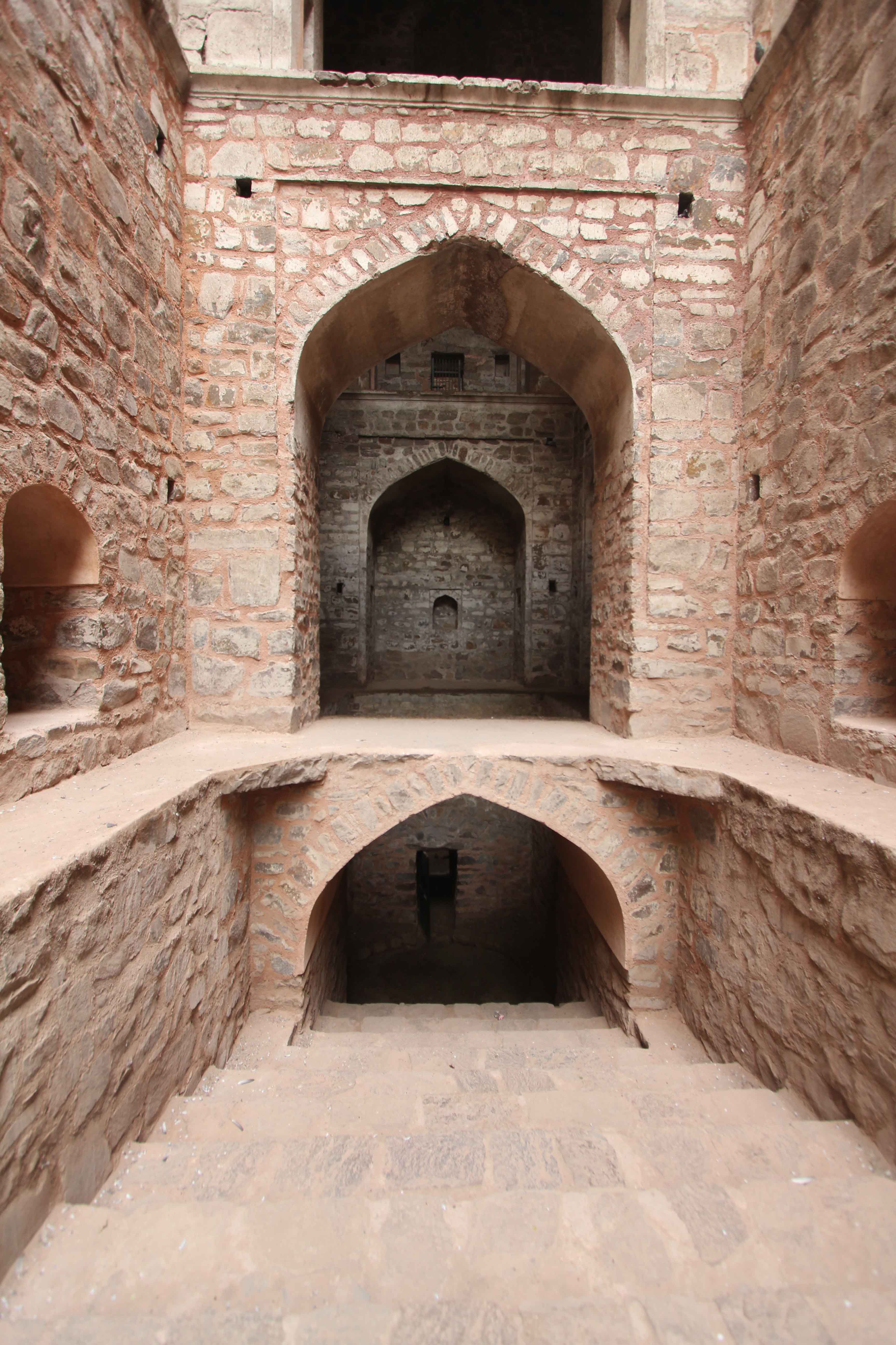 The structure is made of rubble and dressed rock. At its base, the baoli is perhaps 15 meters wide and the north south length would be about 60 meters. According to its architectural style, experts have concluded that it was constructed in the late Tughlaq or Lodi era. One of my favourite photographers Raghu Rai has taken a fantastic shot here.