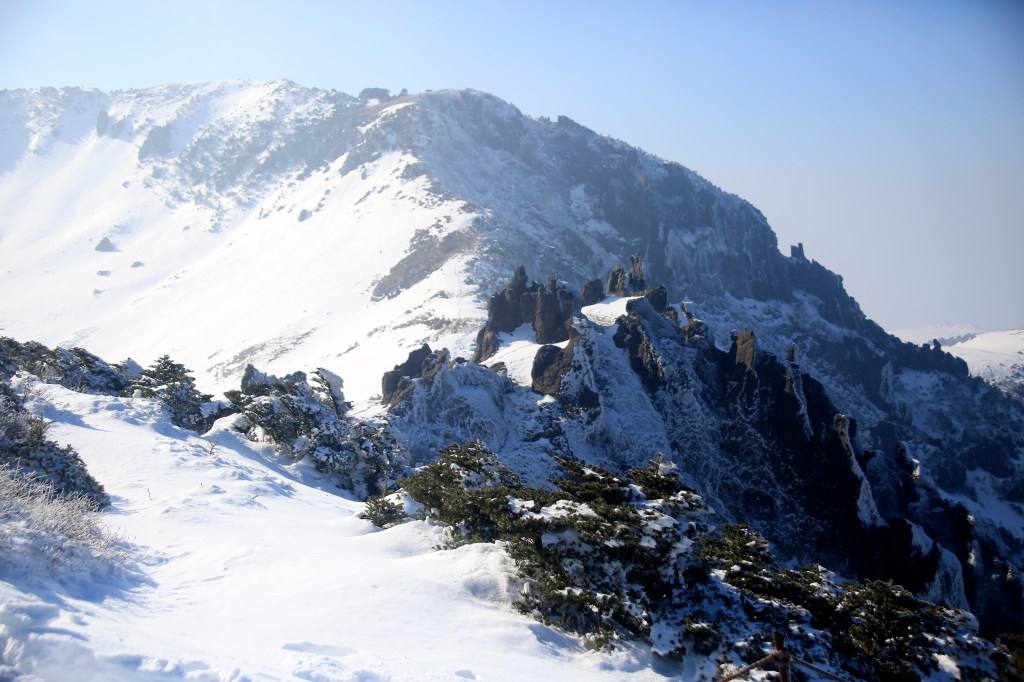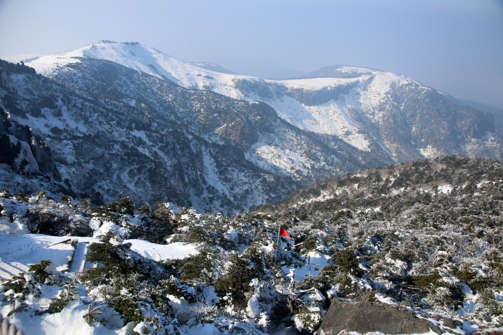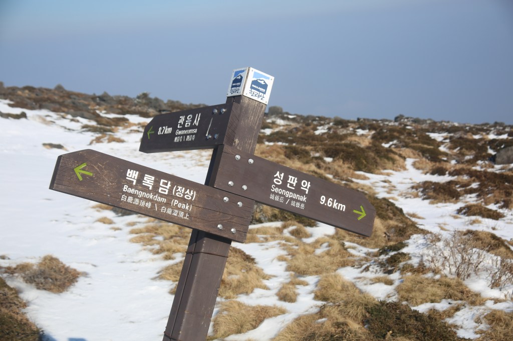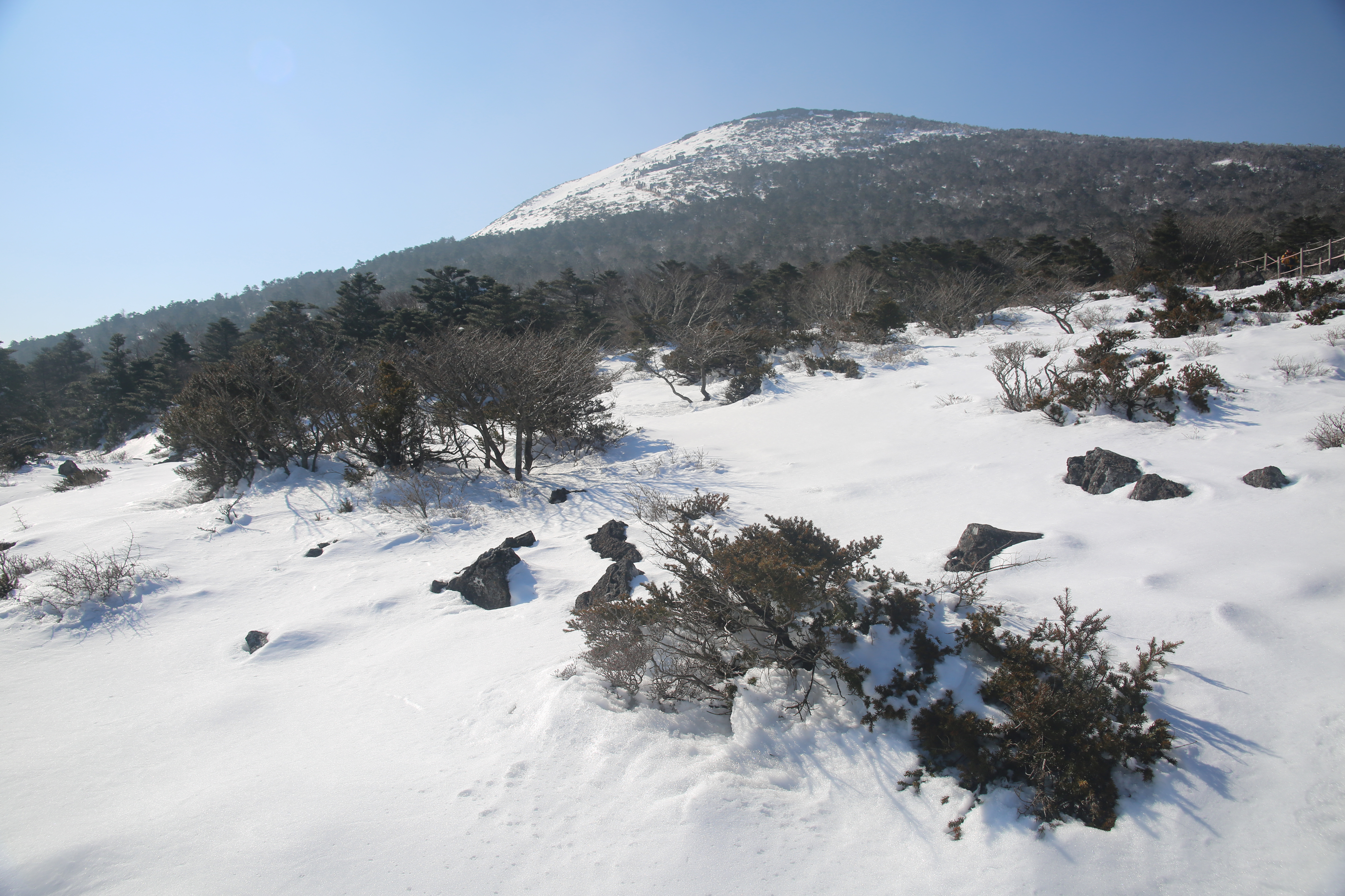 निसर्गाची किमया पाहत थांबायला मला इथं मला जेमतेम २० मिनिटे मिळाली असतील.. पण खाऱ्या वाऱ्याच्या समुद्रकिनाऱ्यापासून अगदी पाच साडेपाच तासात मी एकदम बर्फाच्छादित शिखरावर येऊन पोहोचलो होतो. धाप लागली असली तरीही स्वच्छ हवेचा ताजेपणा अनुभवत होतो.. बर्फावर परावर्तित होणारा शुभ्र प्रकाश आणि मागे स्वच्छ निळं आकाश लक्ष वेधून घेत होतं. या पर्वतावर देवांचा अधिवास आहे त्यामुळं इथं मुक्काम करायचा नाही अशी कोरियन लोकांची श्रद्धा आहे. हाला पर्वत हा दक्षिण कोरियातील सर्वात उंच बिंदू आहे. आता मला सूर्यास्त होण्याच्या आत उतरणं भाग होतं त्यामुळे मी अधिक फोटोजेनिक असलेल्या ग्वानेउमसा मंदिराच्या वाटेने उतरायचं ठरवलं.