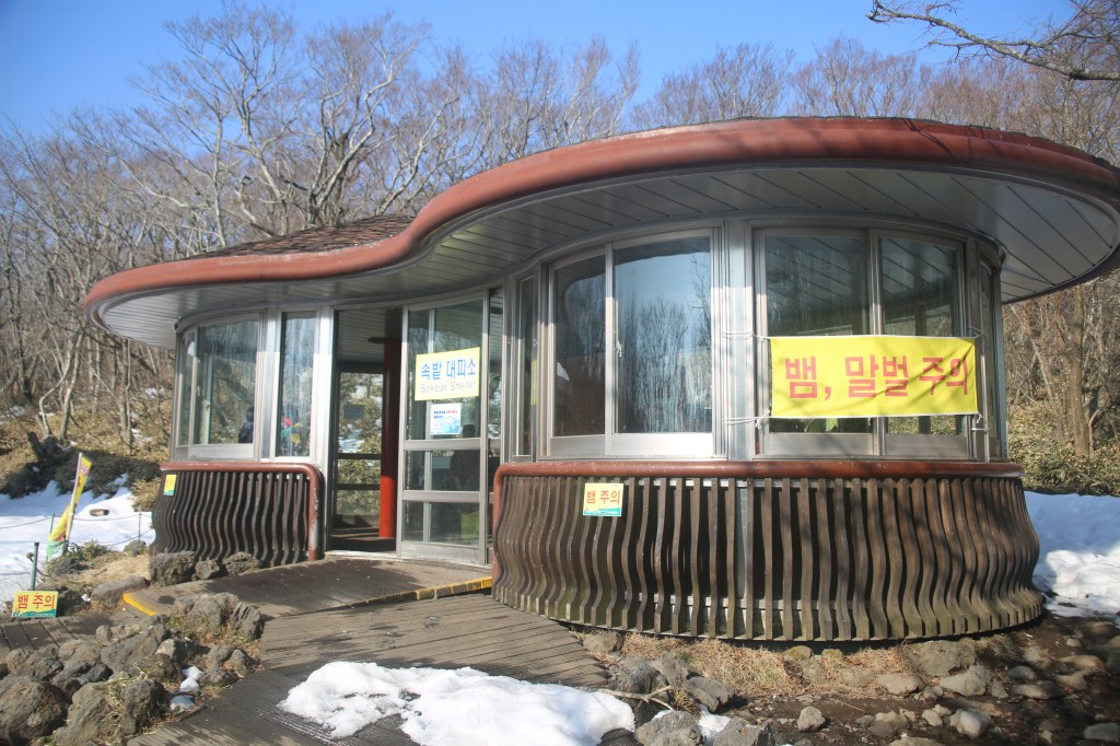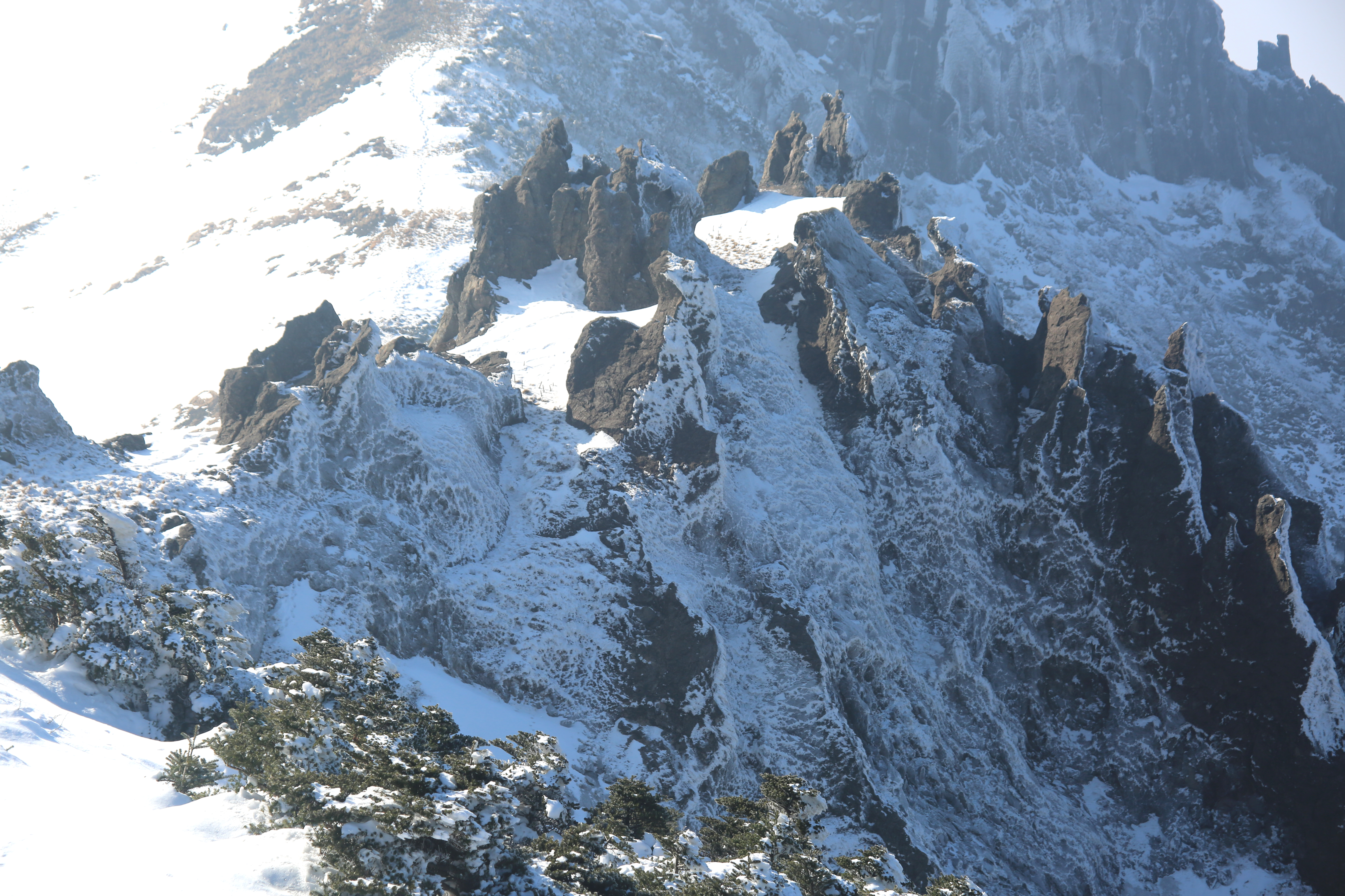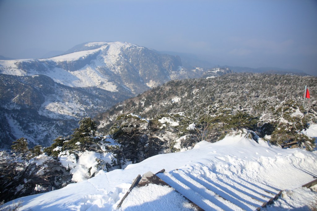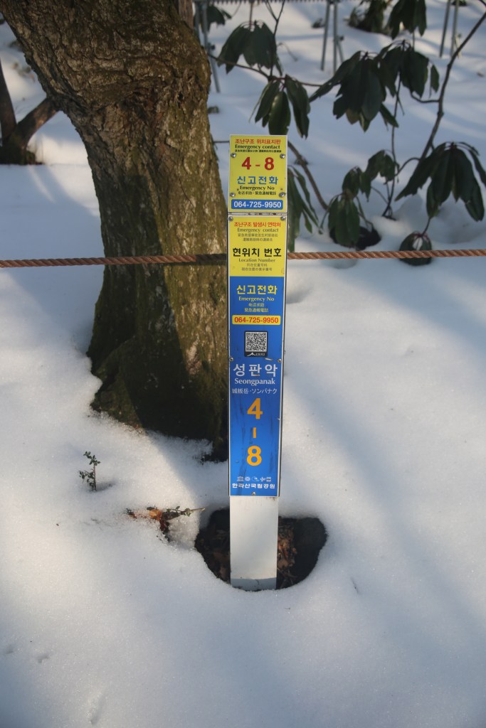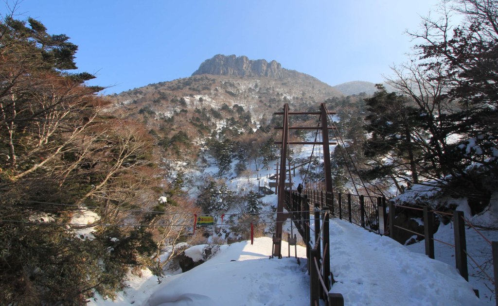 निसर्गाची किमया पाहत थांबायला मला इथं मला जेमतेम २० मिनिटे मिळाली असतील.. पण खाऱ्या वाऱ्याच्या समुद्रकिनाऱ्यापासून अगदी पाच साडेपाच तासात मी एकदम बर्फाच्छादित शिखरावर येऊन पोहोचलो होतो. धाप लागली असली तरीही स्वच्छ हवेचा ताजेपणा अनुभवत होतो.. बर्फावर परावर्तित होणारा शुभ्र प्रकाश आणि मागे स्वच्छ निळं आकाश लक्ष वेधून घेत होतं. या पर्वतावर देवांचा अधिवास आहे त्यामुळं इथं मुक्काम करायचा नाही अशी कोरियन लोकांची श्रद्धा आहे. हाला पर्वत हा दक्षिण कोरियातील सर्वात उंच बिंदू आहे. आता मला सूर्यास्त होण्याच्या आत उतरणं भाग होतं त्यामुळे मी अधिक फोटोजेनिक असलेल्या ग्वानेउमसा मंदिराच्या वाटेने उतरायचं ठरवलं.