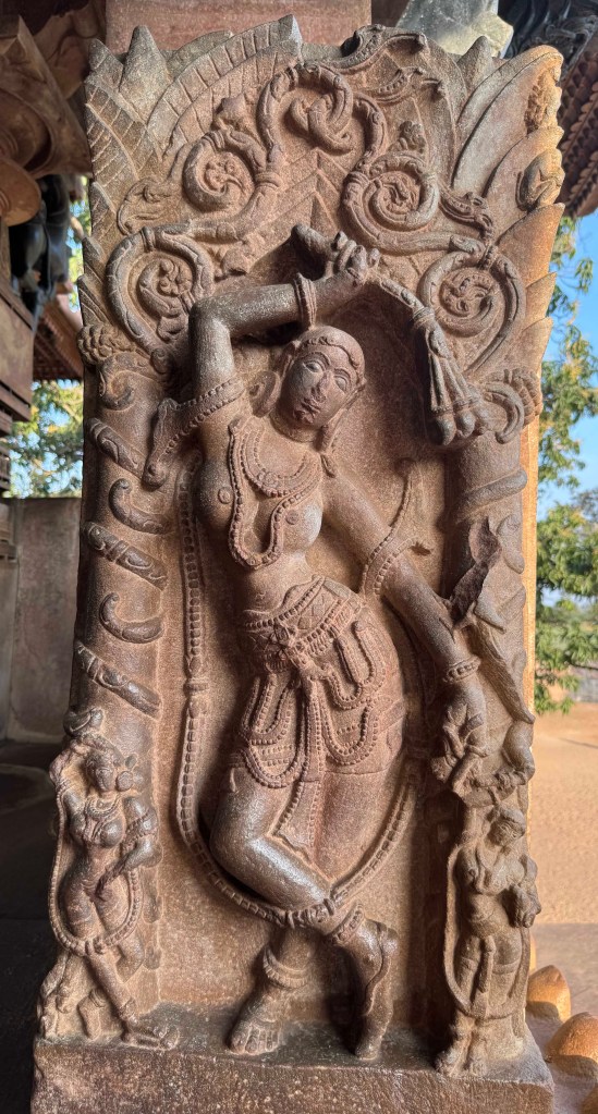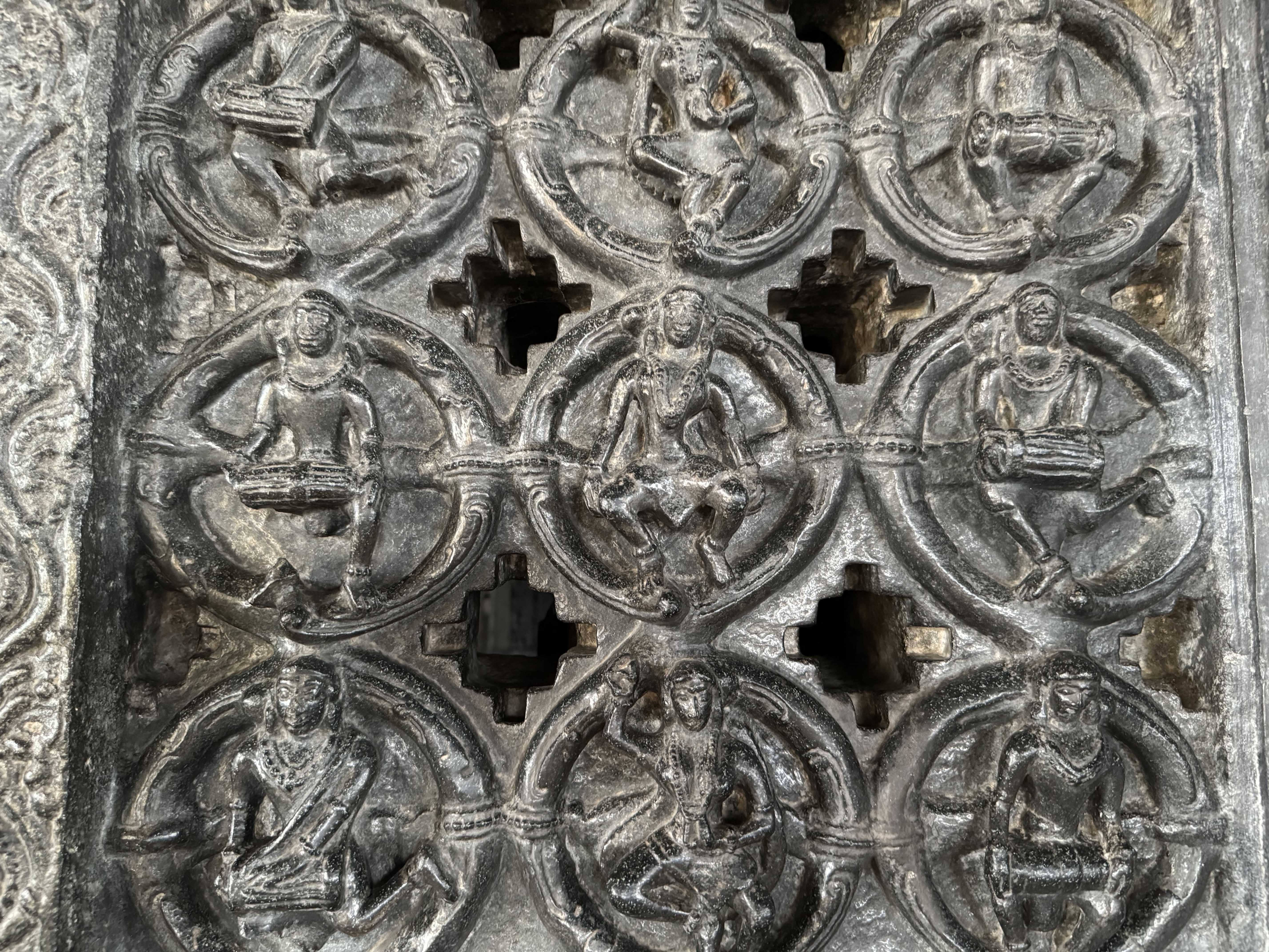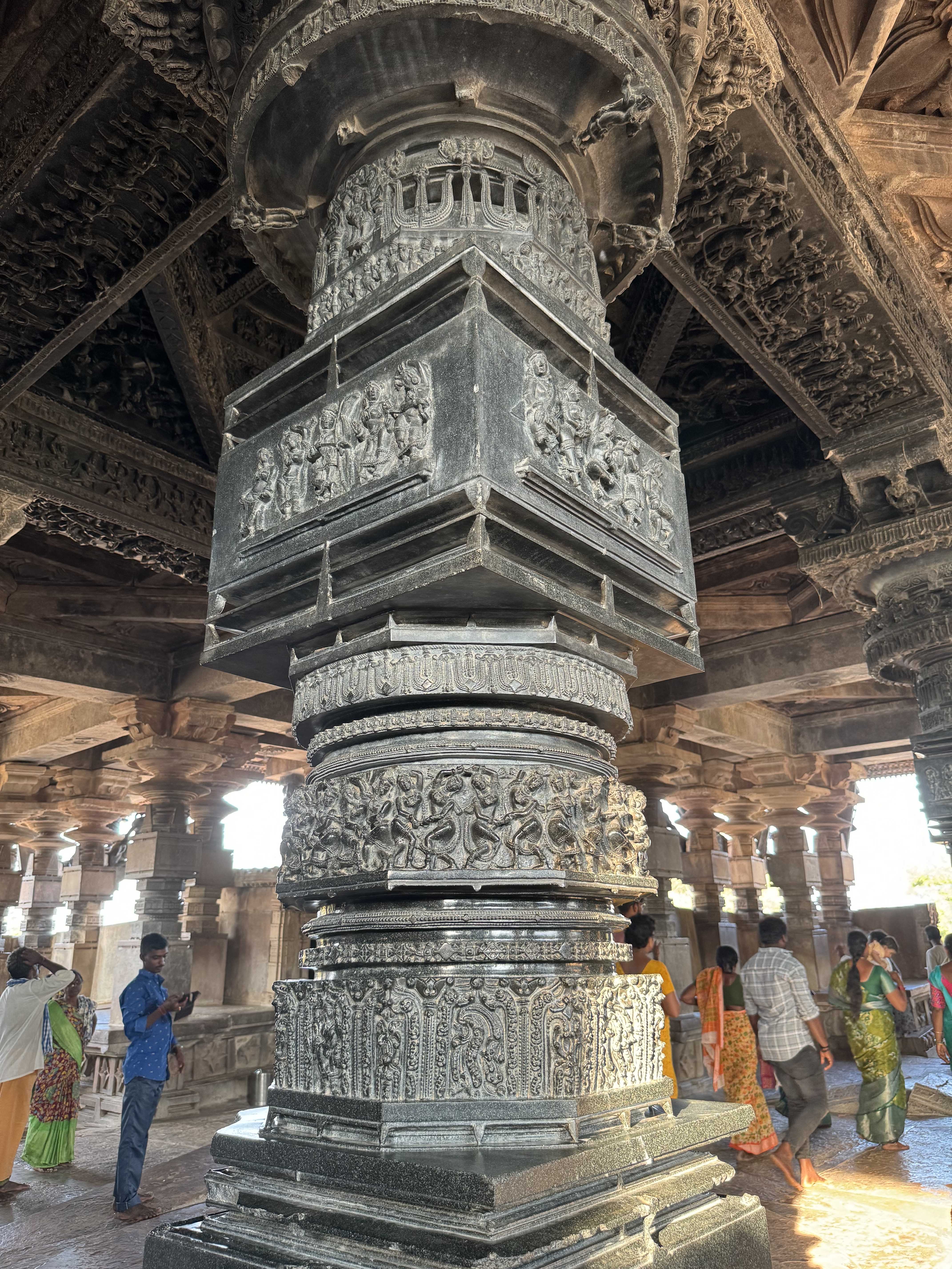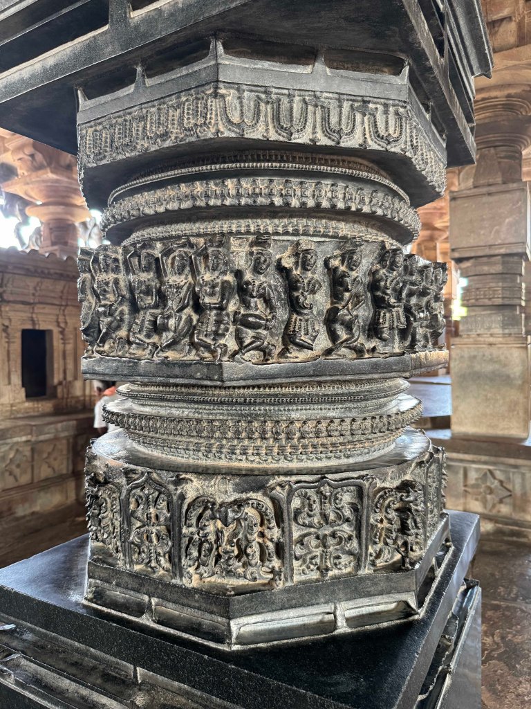 Marco Polo, a famous traveller who visited the Kakatiya empire in the 13th century, wrote a wonderful description of this temple: “It is the brightest star in the galaxy of temples.” Temple columns are adorned with intricate carvings on incredibly strong black basalt material. It brings forth visual themes from the Kakatiya dance traditions, and many of those stances can be seen on the columns as musicians and dancers engraved on them.