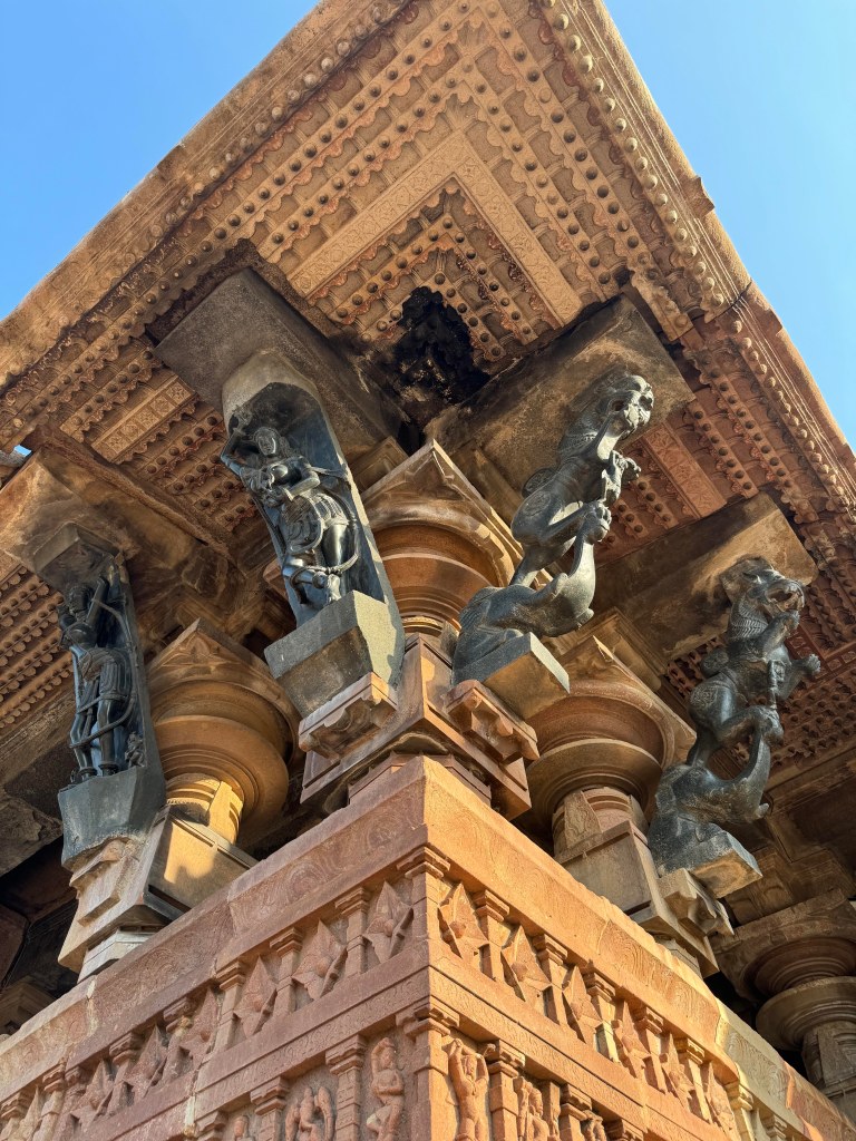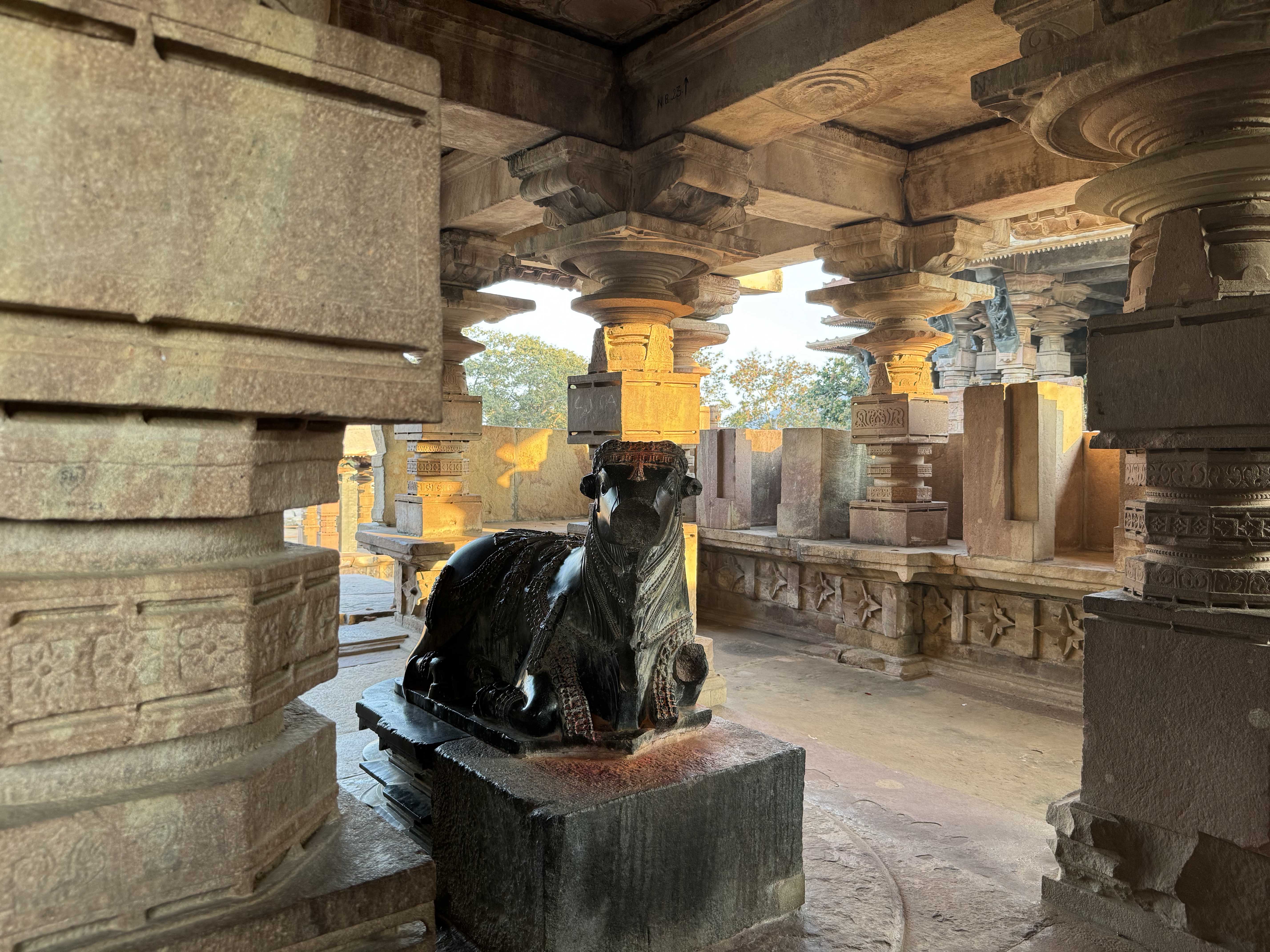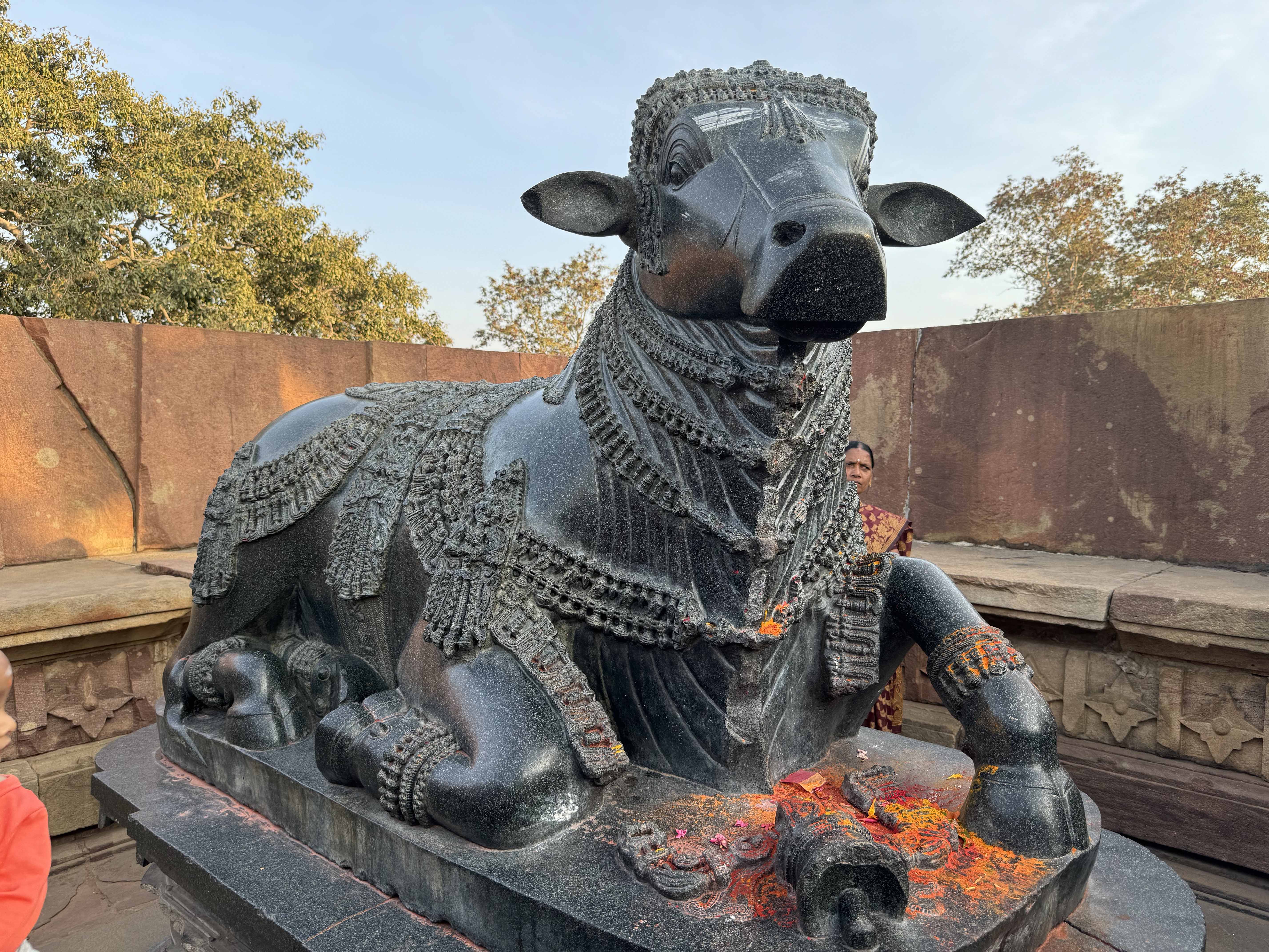 The master structure of the temple has been built from the local red sandstone. However, it is famous for beautifully carved black basalt sculptures with ornate surfaces and metal like shine. The grandest and finest example of this artistry is the big Nandi sitting on the platform opposite the main deity