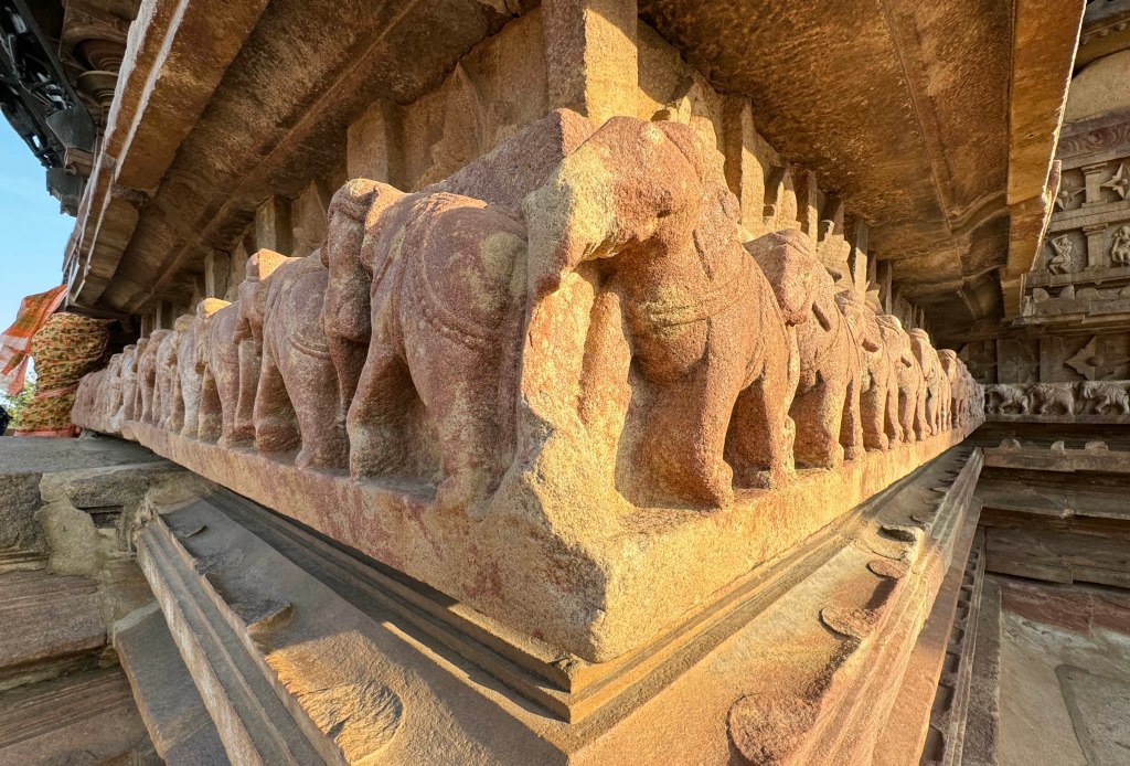 The temple stands on a 6-foot-tall star-shaped platform, and we see a row of 526 elephants walking in a direction signalling that visitors should take the Parikrama route.