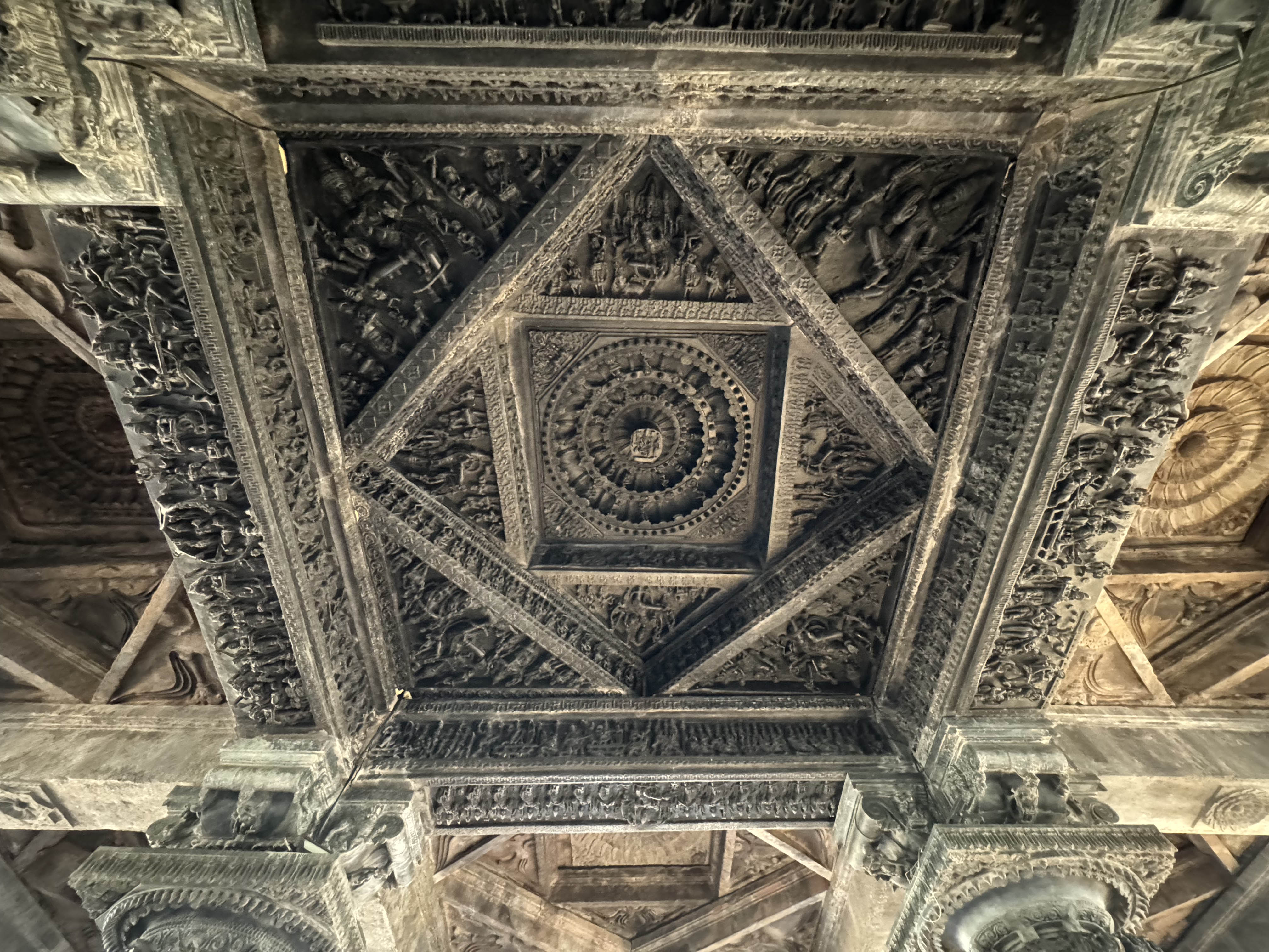 The main temple is flanked by two other Shiva temples, Rameshwaraiyya and Kateshwaraiyya. If you look closely at the roof slab, you can see hemispherical decorations facing the platform.